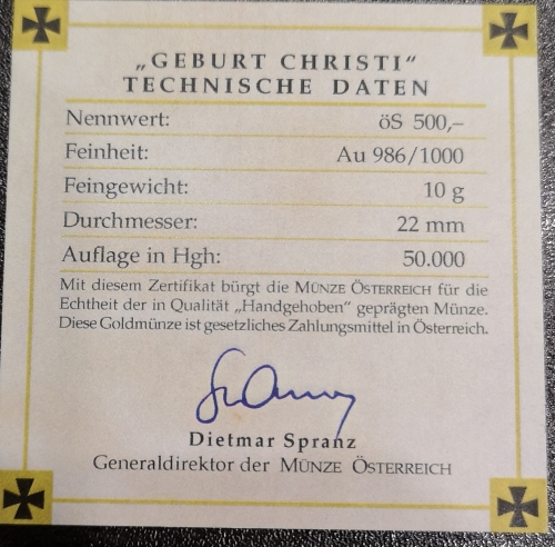 500 шиллингов 2000 года "2000 лет Христианства, Рождение Христа", 10 гр.