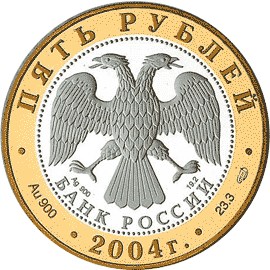 на диске – эмблема Банка России (двуглавый орёл с опущенными крыльями, под ним – надпись полукругом «БАНК РОССИИ»), обрамлённая кругом из точек, слева – обозначение металла, проба сплава, справа – содержание драгоценного металла в чистоте. На кольце по окружности – надписи: вверху – «ПЯТЬ РУБЛЕЙ», внизу – «2004 г.», слева – обозначение металла, проба сплава, справа – содержание драгоценного металла в чистоте и товарный знак монетного двора.