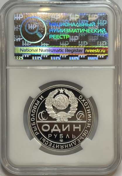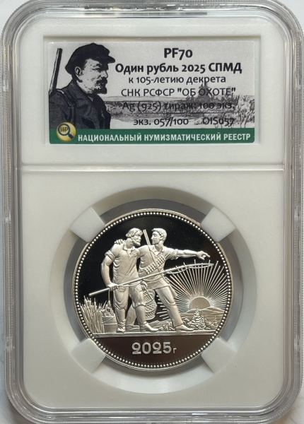 Монетовидный серебряный жетон Рубль 2025г., "К 105-летию декрета СНК РСФСР ОБ ОХОТЕ" ТИРАЖ 100 шт.,AG 925, в слабе ННР PROOF 70