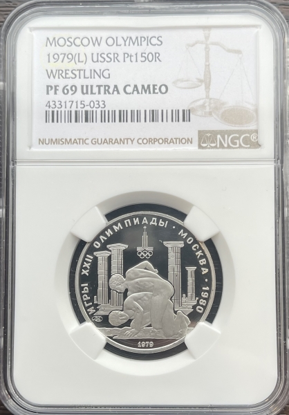 Слева и сверху вдоль канта слова «ИГРЫ XXII ОЛИМПИАДЫ», справа разделенные точкой слово «МОСКВА» и год проведения XXII Олимпиады «1980», сверху эмблема XXII Олимпийских игр, ниже схватка древних борцов, за ними панорама развалин Олимпии, под развалинами слева монограмма монетного двора «ЛМД», внизу у канта год выпуска монеты «1979».