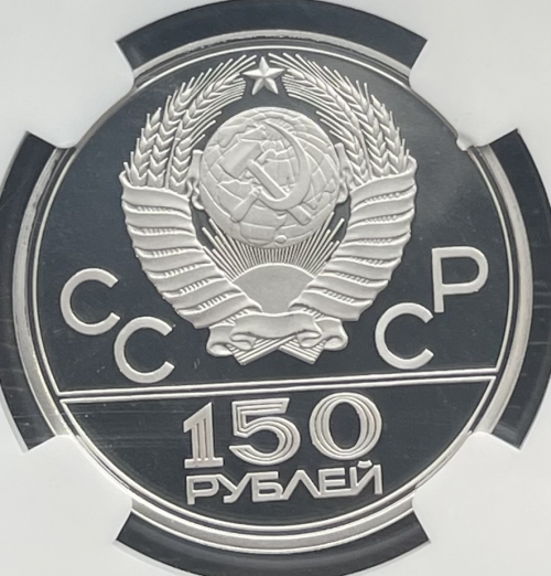 Сверху герб СССР с 15 витками ленты, слева от него буквы «СС», справа «СР», ниже двойная черта, под ней обозначение достоинства монеты цифра «150» и ниже слово «РУБЛЕЙ».