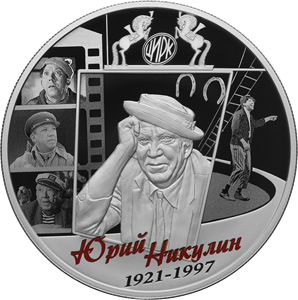 на зеркальном поле диска — рельефное изображение портрета Юрия Никулина в окружении изображений образов артиста: слева, на стилизованном изображении кинопленки, — из кинофильмов и телепередачи, справа — из циркового номера; вверху — рельефное изображение логотипа Московского цирка Никулина на Цветном бульваре, внизу — выполненная в цвете надпись «Юрий Никулин» и годы жизни: «1921–1997».