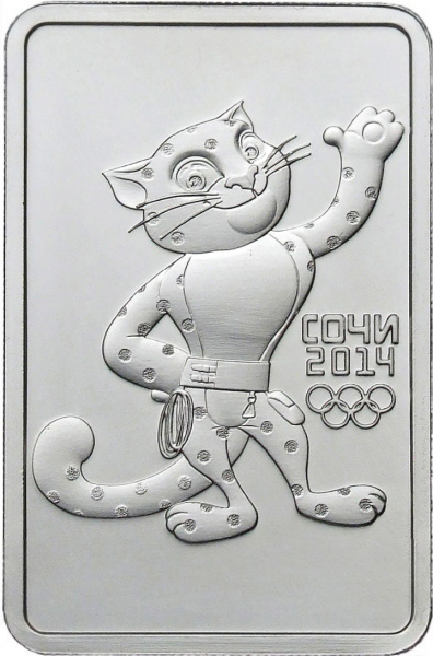 • Серебряная монета 3 рубля Леопард серии XXII Олимпийские зимние игры и XI Паралимпийские зимние игры 2014 года в Сочи выпущена ЦБ России 27 декабря 2011 года. Монета имеет прямоугольную форму с закругленными углами. Леопард – официальный Талисман зимней Олимпиады 2014 в Сочи.