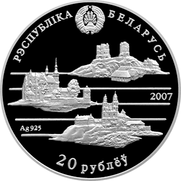 Аверс: вверху – рельефное изображение Государственного герба Республики Беларусь, в центре на стилизованном нотном стане – фрагменты архитектурно – ландшафтных пейзажей Беларуси, выполненных с рисунков Н.Орды, справа – указан год чеканки (на серебряной слева – проба сплава); надписи по кругу: вверху – РЭСПУБЛІКА БЕЛАРУСЬ, внизу – 20 РУБЛЁЎ – (на серебряной) и 1 РУБЕЛЬ – (на медно – никелевой).