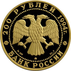 изображение двуглавого орла (художник И. Билибин), по кругу надписи: вверху - "200 РУБЛЕЙ 1994", внизу - "БАНК РОССИИ". В нижней части - обозначение металла, проба сплава, товарный знак монетного двора и содержание драгоценного металла в чистоте.