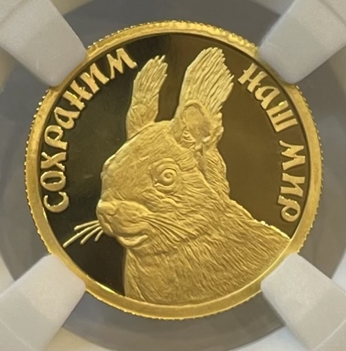 Золотая монета 50 рублей "Белка" в слабе ННР PROOF 70 ,7,78г, 2023 год
