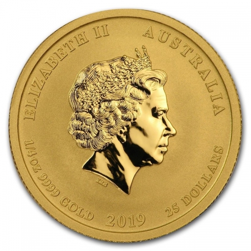 На аверсе изображен профиль королевы Елизаветы II. Сверху надписи: «ELIZABETH II» (Елизавета II) и «AUSTRALIA» (Австралия). Также внизу указаны вес (0,25 oz – 0,25 унция), проба (9999), название металла (Au - золото), год (2019) и номинал монеты – «100 DOLLARS» - 25 австралийских долларов.
